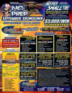 Share Facebook Twitter LinkedIn Pinterest Email 1st Annual No Prep September Showdown Sept 12 and 13 Official Flyer. Small Tire- $5,000 to WIN GUARANTEED No Min Car Count No Buy In Also in Action Little Gangsters Daily Driver 6.00, 6.50, 7.00 Index Open Bracket Jr Dragsters Beaches, Casinos, Seafood Restaurants Minutes Away!!!!!!