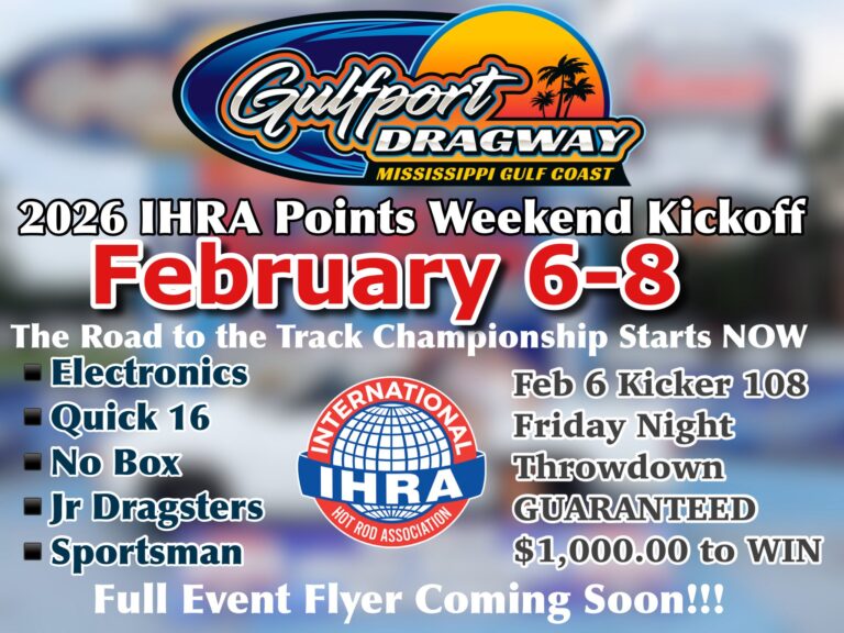 Gulfport Dragway is minutes away from the MS Beaches. This a great way to park/camp is safe and quiet area and still be close to all of the CTC activities/venues.