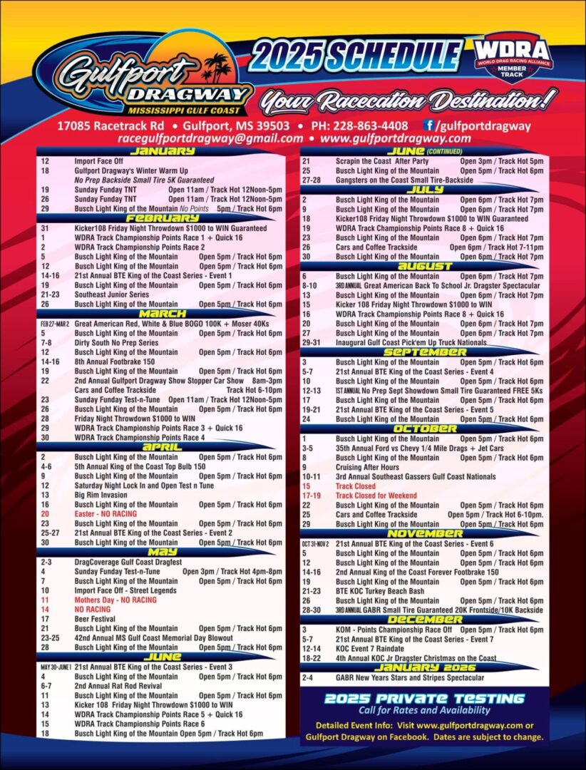 2025 Gulfport Dragway Master Schedule