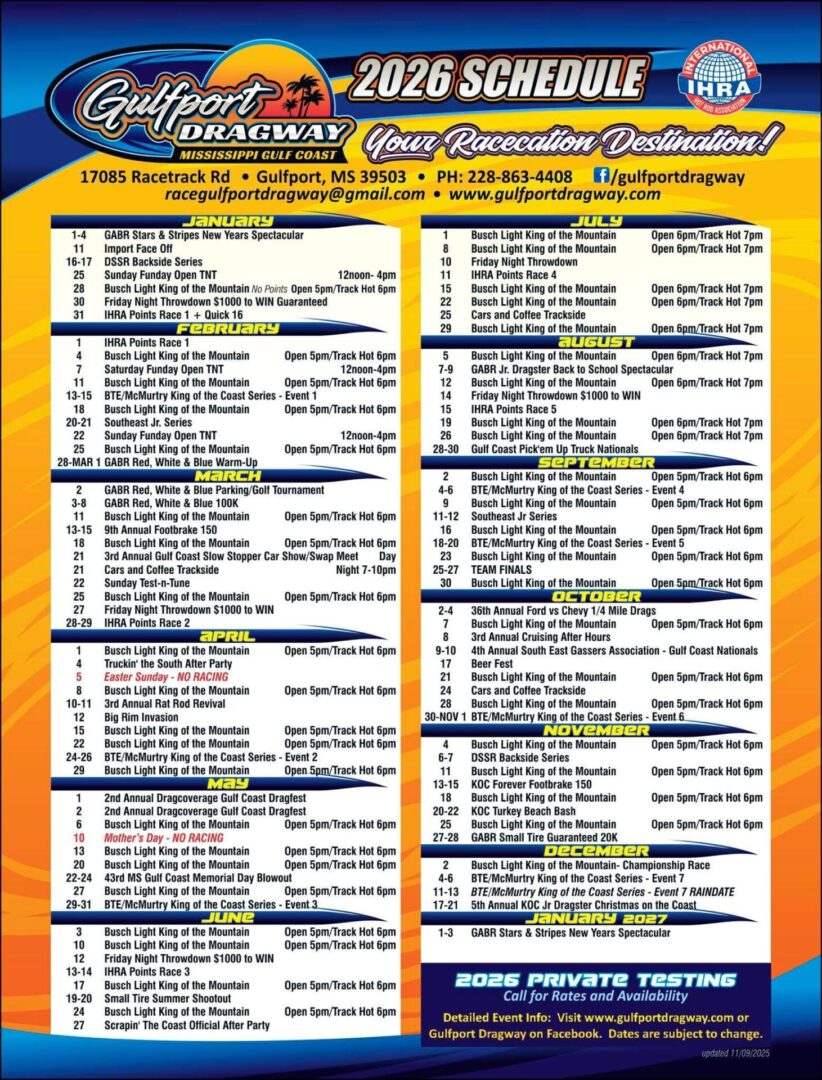 Extreme Cold Weather Forecast Forces Schedule Changes for Upcoming Events Busch Light King of the Mountain Series and Gulfport Dragway IHRA Track Championship Points Series Kickoff.January 27, 2026