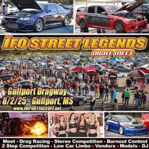 No classes, no rules, just party! Calling all street cars, trucks, and bikes! The IFO Street Legends NIGHT meet is coming to Gulfport Dragway in Gulfport, MS on August 2nd, 2025! This is an open to all makes meet/party with DJ, models, 2 step/rev battle, burnout contest, stereo contest, low car limbo, and no time, instant green grudge racing on the dragstrip! *Time slips still provided to racers.