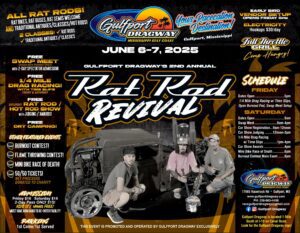 Share Facebook Twitter LinkedIn Pinterest Email Rat Rod Revival THIS FRIDAY AND SATURDAY at Gulfport Dragway June 6-7!!!!! ALL Rat Rods, Rat Bikes, Rat Buses, Rat Semis WELCOME ALL Rat Rod Clubs Invited and Welcomed FREE SWAP MEET w/paid 2 Day Spectator Admission. Open Burnout Pad 1/4 Mile Drag Racing w/Time Slips. FREE Rat Rod/Traditional Antique/ Classics Car Show w/Spectator Admission. FREE Dry Camping. Mini Bike Race of Death Burnout Competition.