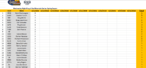 The Busch Light Wednesday Night King of the Mountain Spring Points after Race 1.